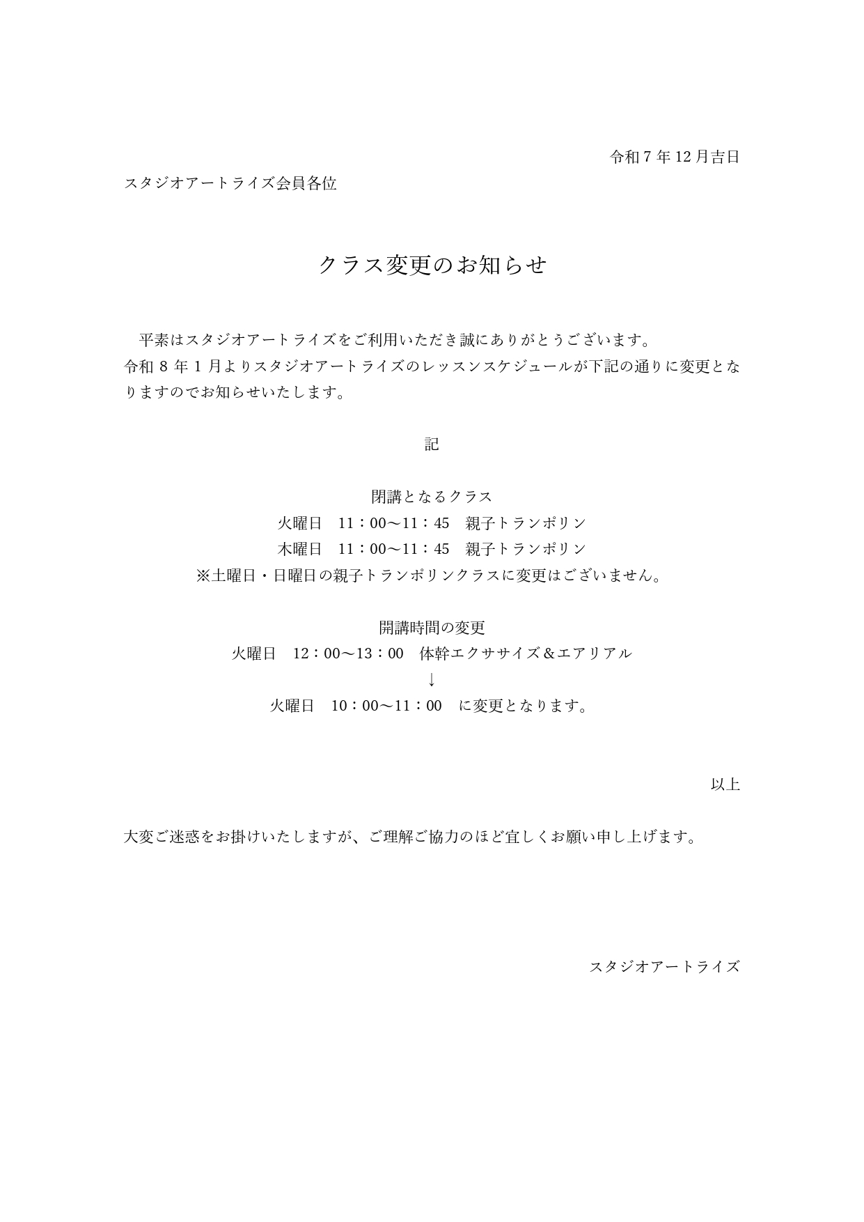 ARTRIZよりお知らせです。 12月24日〜26日でARTRIZ冬季ワークショップ開催します。 本日より受付開始しました! 幼児アクロバット(定員10名) 幼児跳び箱(定員10名) キッズ転回特訓(定員15名) キッズバク転特訓(定員15名) ※各クラス定員になり次第〆切になります。 お早めにご予約ください。 非会員の方でも受講可能です。 12月24日(月) 幼児アクロバット 13:00~13:50 キッズ転回特訓 14:00~15:00 12月25日(火) 幼児アクロバット 12:00~12:50 幼児跳び箱 13:00~13:50 キッズバク転特訓 14:00~15:00 12月26日(水) 幼児アクロバットクラス 13:10~14:00 キッズバク転特訓クラス 14:10~15:10 ご予約は電話・メール・スタジオ受付にてお願いします。 お問い合わせもご気軽にご連絡ください! スタッフ一同お待ちしております。 Studio ARTRIZ 東京都江東区亀戸8‐10‐8 横山ビル1階 03-5875-5761 #Studio #Artriz #アートライズ #スタジオ #体操 #体操教室 #跳び箱 #マット #トランポリン #バク転 #アクロバット #幼児 #キッズ #習い事 #亀戸 #江東区 #ワークショップ #転回 #幼児体操 #幼児アクロバット